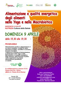 Domenica 9 aprile ore 15,30-19.30 nuovo appuntamento “Alimentazione e qualità energetiche degli alimenti nello Yoga e nella Macrobiotica”, con il piatto della Salute: crudità di radici, sformato di miglio, cavolfiori e curcuma, tempeh con cavolo cappuccio mela e umeboshi” dalle 15,30-19,30 , presso AVA, “Associazione Vegana Animalista” Roma, Piazza Asti, 5/a (Metro Re di Roma).